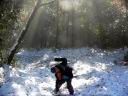 今年の岐阜のクリスマスイブは50年ぶり大雪に見舞われ、金華山もきれいに雪化粧されました。土曜日は天気も回復し絶好の雪遊び日和になりました。木の枝細工のプログラム(現地調達予定の材料はすべて雪の下)を急遽変更し、雪の森体験・雪遊びに切り替えました。思いがけない大雪に驚いたのか、キャンセルが入ってしまい、参加者はわずか2名。残念!それでも常連の二人は雪の岩度公園でおおはしゃぎ。雪の上にねっころがるは、誰かが作った鎌倉の中に入り込むは。気が付いてみるとM君の長靴は雪が一杯入ってしまって靴下はびしょぬれ。あえなくリタイヤ。お父さんに迎えられ帰っていきました。やはり雪遊びは足回りが肝心ですね。そして一人残ったD君。元気一杯なので頂上を目指すことになりました。普通のルートでは面白くないので誰も通っていない秘密のルートで(といっても前日に良さんが下見に入っています)。イノシシの足跡がいっぱいで、今朝ほど掘り返したと思われる跡も。雪が降ったあとは思いがけない発見があります。何よりも山が美しい。景色が美しい。登っている人が少ないのがもったいない感じ。D君は滑りやすい山道を平気で登っていってついに頂上に。一面雪に覆われた濃尾平野がとてもきれいです。頂上では雪をかぶった木立の中でスズメやメジロなどが遊んでいました。おいおい、そんなに追っかけると逃げてしまうと。D君は下りも見事ノーミスでクリアー。最後は特製手作りスロープでゴミ袋そり遊び。D君は頑張って最後に最長不倒記録を出しました。こんな楽しい雪遊びを独り占めにするなんて贅沢。そしてもったいない。