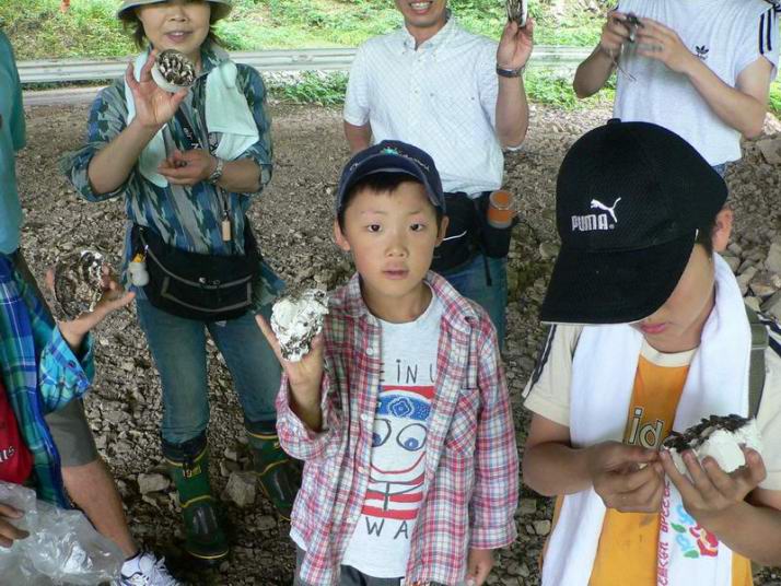 そしていよいよ動物の足跡探しへ。まずは注意。君たちは捜査員です。現場を荒らしてはいけません。気をつけて歩きましょう。みんな泥んこの中へ入っていきます。長靴がない子ははだしで。自分の好きな足跡をきめて石膏どりにかかります。石膏のとき加減は微妙なので指導者のほうでやってあげました。型枠を差込み、石膏を流し込み待つこと数十分。うまくできているかな?そして期待の取り出しの瞬間……。うまくいきました!大物のイノシシ、小物のアライグマ。しっかり足跡が出ています。ちなみに一番出来がよかったのは取材に来ていた特別参加の岐阜市NPO・ボランティア協働センターのHさん。アライグマの足すばらしくきれいに取れていました。動物の足跡石膏どりは大人がやっても絶対面白い。全員いいお土産ができました。