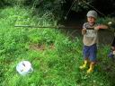 そしていよいよ今回のメインテーマ「犯人探し―ザリガニを食べたのは誰だ―」です。事前に状況設定を書いたプリント(野生動物の石膏の足跡の型も)を用意したのですが、現場にいってみるとザリガニを食べた残骸が!水の中には真新しい足跡が残っていました。「犯人」は誰だ!?以前もここに来ている子どもにはすぐわかりました。「犯人」は間違いなくアライグマです。(ここからは「犯人探しゲーム」でもあります。)まずは<聞き取り調査>。達目洞の主、臼井さんに家に話を聞きに行きました。イノシシは最近出るようになったという話。アライグマについては見たことがないとの話。また、植木鉢で守っておいた小玉スイカがそのままの状態で中身が食べられたとの話(「犯人」は誰だ!―アライグマ?ハクビシン?)捜査の意欲が沸いてきました。最後は「犯人」をとらえる(といってもワナで捕まえるのとはできないので、自動カメラで写す作戦)計画です。そして<おとり作戦>。エサでアライグマをおびき出そうというもの。エサはザリガニ。それではザリガニ釣りに行きましょう。仕掛けは簡単。その辺で拾った木の枝やメダケの先にタコ糸を結びつけスルメを先につけてたらすだけ。良さんの子どものころ(高度成長以前)にはいっぱいいたザリガニもずいぶん少なくなりなした。果たして釣れるのでしょうか。苦労してやっと1匹つりあげました。あと2匹は手で捕りました。まずは計画は順調に進みました。