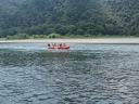 「鵜飼広場」の下でみんなでEボートを膨らませスタート。もちろん、スタート前にはセイフティトークを行い、スローバッグの体験も行いました。晴天続きの猛暑で心配されましたが、そこそこ水量もあり、思ったより水は澄んでいました。金華山をバックに気持ちよく下っていきます。