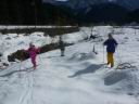 帰りはスタート地点のNEOキャンピングパークまで一気に…といきたいところでしたが、子どもたちは遊べる斜面を見つけては滑降にチャレンジ。大幅に予定時間を過ぎてしまいました。雪がなければたわいもない川原かもしれません。それが雪が積もるとと、こんなに楽しいフィールドに一変します。少人数で自然の<遊び場>を独占してしまうのがもったいないほどです。