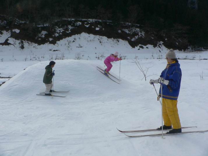 | NEOキャンピングパークからスタート | キャンプ場横のスロープでまずは一滑り | あ〜〜!親子でクラッシュ | H姉弟、冬の根尾東谷川原の小ピークに初登頂! | 頂上からドロップイン |