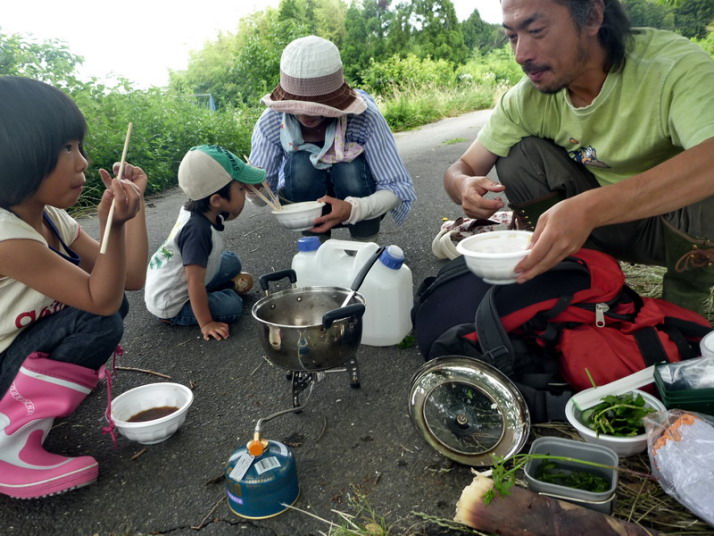 シジミのいる小川は、今日は降った雨の影響で水かさがまし、流れが速い。水の中に入って奮闘するも「今日はダメ」。それでは目標達成とはいけません。「釣れるまで上がってくるな」、小川の中にいる千葉ちゃんに指令を出し、頑張らせます。ねばること××分、「釣れたぞー!」。やりました!草の柄の先にはしっかりとシジミが。参加所の子どもがとったシジミと合わせて早速シジミ汁に。伊藤さんがどこで採ってきたのか(現地調達)、たけのこ(マダケ)とみつばとをもってきてくれました。野外で料理したシジミ汁の味は?シミジミ美味しい!満足のシジミ採り&シジミ汁でした。