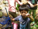 そこで今回のメインプログラムは、サワガニとり。前回、サワガニを見つけた沢でみんなで探すこと。思いがけなく20名を超える参加者になりましたが、見つけることができるかな?散策路わきの小さな沢でサワガニを探します。「見つけた!」、「とった!」の声が聞こえてくるころになると、子どもだけでなく大人も夢中になってさがしまわります。全員めでたくサワガニを見つけることがきました。とったサワガニを食べる楽しみは次回に。
