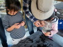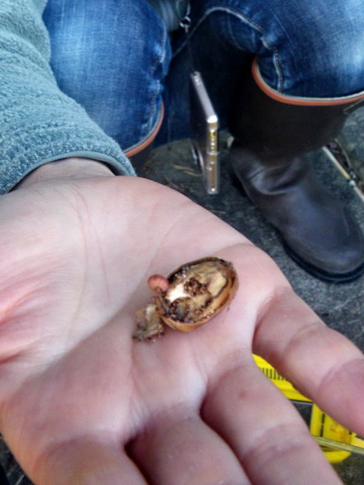 まずはクヌギの木を探して<ドングリ拾い>。クラフトの材料集めではないので「穴の開いた」アベマキのドングリを探します。この「穴あきドングリ」の中にお目当ての<ドングリムシ>が入っている(可能性がある)のです。しかし、そのドングリが少ない!イノシシが食べてしまった!?それともシカが?残念!でも「ふがりの森」は動物たちの楽園でもあるのでこれもしょうがないですね。このことを想定して金華山でドングリをたくさん拾ってきました。それでもドンクリ拾いは楽しいですね。