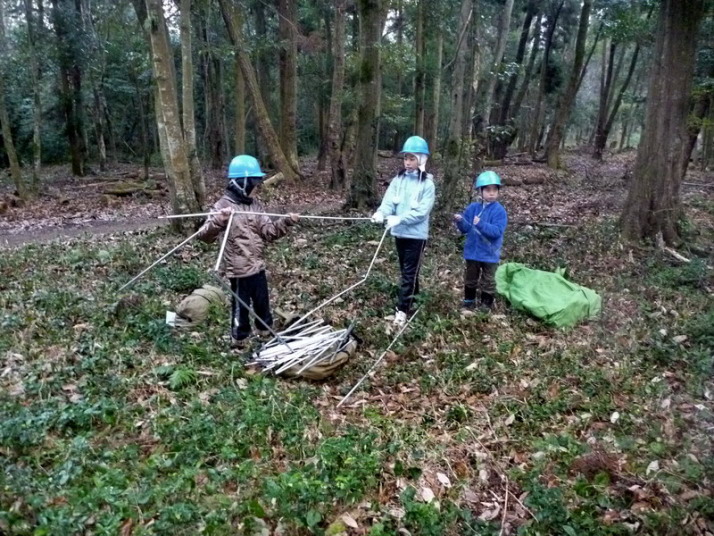 11月の<森のソロビバーク>(森の中で寝袋とマットとブルーシートだけで一人で一夜を過ごす)は天候にも恵まれず結局流れてしまいました(小さい子にはちょっと厳しかったかな?)。そして、シリーズを締めくくる「森のキャンプ」、寒い冬の到来もあってこれも流れか、と諦めかけていた時、エヌエスネットの自然体験の常連さんから申込みが入り、何とか実施のこぎつけることができました。