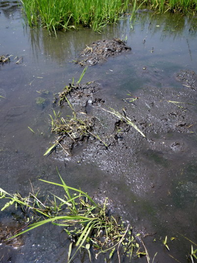 | カエル(トノサマガエル)見つけた! | ドジョウもとれたよ。 | 田んぼの中に足跡が(ヌートリア?) 分かるかな? |