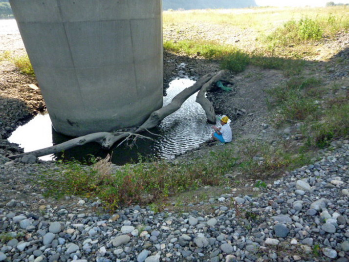 長良川は渇水して流れも弱く水中の石は水垢がいっぱいついてしまっていました。最初の釣りエサ探し。川岸に近いところでは、石の裏についているのはヒラタドロムシばかり。よろしくない!少し深いところまで入って、新しい巣を見つけ、やっと川虫(ヒゲナガカワトビケラの幼虫)を捕まえました。今回は釣りが初めての子どもばかりで、最初はきもちわるいと言ってましたが、小石をくっつけ作ったトビゲラの巣に興味をもって喜んで川虫探しをするようになりました。