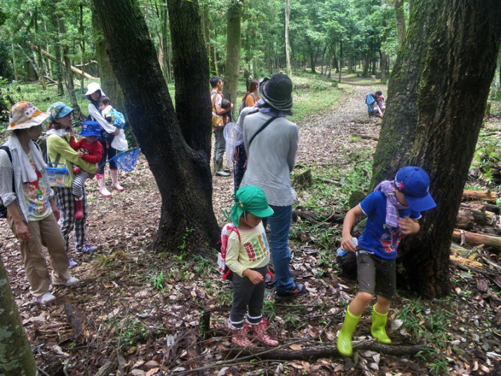 まずは森の自然観察から。毎月、森の自然体験を計画していますが、1ヶ月もたつと森の風景が一変します。森の緑はすっかり濃くなって生きものの気配も濃くなっています。それでもやぶ蚊やブヨなどの虫があまり気にならないのは森の空気がよどんでないからでしょうか。地元の方が散策路の周辺を整備されているおかげでもあります。そして何よりもこの森が「神の森」であることが大きいのでしょう。ちょうどこの日は「山の講」の日で地元の方が山の神にお参りに来て見えました。私たちも森の神様に挨拶して森の中に入っていきました。
