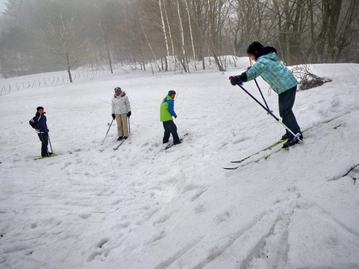 初日の野麦入り。別れを惜しむのか、野麦学舎は霧の中にたたずんでいました。あたりは一面雪のフィールドで、早速、板(クロスカントリースキー)を履いて出発しました。雪のグランド(旧高根小学校野麦分校の校庭)。から滑り降りて、民家の裏をまわり込んで森の中に入ります(スキーを履いてどこにでも行ける!)。道路を渡って集落の下(しも)の畑を滑ります。(これで春のキャンプで、野麦の中、周辺の雪の畑、森を全て踏破!)続いて、上(かみ)の畑に向かいます。(この時期、下や高山のほうに下りてしまっている人が多く、住んでいる家はわずか2軒)集落はひっそりと静まりかえっています。遅い昼過ぎの到着でしたが、いきなり、ネイチャースキーでしっかり遊ばしてもらいました。夜は梶さん(梶浦敬一先生)のスペシャルプログラム。「糸引き」の工女の歴史で有名な野麦にちなんで「繭玉細工」を教えてもらいました。今回の参加者はみな集中力を発想力がすばらしくみごと名作品が出来上がりました。