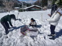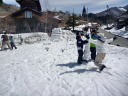 3日目はメインプログラムの雪上オリンピックとイグルー作り(翌日が雨の予報で1日前倒ししました)。雪上オリンピックは<聖火台>作りから。うまい具合に除雪された雪がグランドの隅に高く積み上げられていたのでそれを利用しました。そして聖火リレー(初めての試み。ちゃんとトーチも作りました)からスタート。開会式の選手宣誓から始まり、<雪玉的あて>、<バブルの塔>(雪で積み上げた塔の高さ比べ)、<雪上カーペットレース>、<スノーフラッグ>(ビーチフラッグの雪上版)と競技が進み、最後は<8の字CXスキーレース>。全員死力を尽くして戦い、白熱した競技の結果は?……、引き分け。その裏には競技委員長(兼名誉総裁)梶さんの絶妙な配点の配慮がありました。