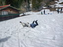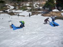 高校生リーダーが合流して、集落の中の畑に滑りに行きます。緩やかな畑の傾斜を滑るだけでは物足らなく子どもたちは除雪でできた雪山の上からの滑るのに挑戦します。