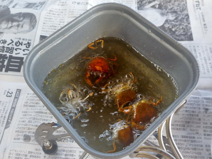 捕まえたサワガニは早速素揚げに。2度揚げして塩を振りかけていただきました。味のほうは?幼稚園児の男の子は「んっ?」ていう顔をしていましたが、小3の女の子とその叔母さん(最初は少し躊躇していましたが)「おいしい!」これですこしはサワガニ好きのイノシシの気持ちがわかった?