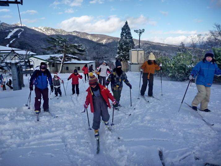 スキー場はわずかな雪を求めて集まったボーダーたちであふれていました。それでも隅っこの人が入っていない狭い雪の斜面を見つけてなんとか「歩くスキー」(クロスカントリースキーで雪の上を歩いて上って滑る)を体験することができました。この日はJRの列車故障事故の影響で、長良川鉄道への乗り継ぎがうまくいかず、2時間も遅れて幸先の悪きスタートになってしまいましたが、この雪のない状況の中で曲がりなりにもCXスキーで遊べたのはこれで良しとしないといけないところでしょうか。