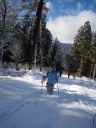 さっそくCXスキーの板を付け森の中に入ります。ふわふわに新雪が積もった林道(作業道)を歩いていきます。森の広場に着きました。今年からジップライン等のアウトドア遊びの施設ができ、少し自然度は下がりましたが、いつものネイチャースキーのフィールドは健在です。子どもたちは登っては滑るを繰り返し楽しみました。 滑って楽しい!転んでも楽しい!これぞネイチャ−スキーです!この後、ゴールの展望台を目指しました。(結果、これが判断ミスで大幅に予定時間をオーバーすることになってしまいました。)展望台からの下り、途中雪の少ないところもあり苦労しましたが、何とか戻ってきました。
