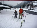 NEOキャンピングパークからスタート。雪が多いのでどこでも滑れる感じです。雪質は湿った新雪。あまり滑らないけど初心者にはかえってスピードが出ないので怖くなくていいかもしれません。ところどころにある「雪の壁」低くなってしまってこちらも恐怖感がない。何度もネイチャースキーを経験している子どもには少し物足らないかも。でも、雪が多いのはやっぱり楽しい。いつもは流れで分断されている雪の河原がつながって本流の水際まで入れる。毎回渡るのに難儀する小川もすっかり雪の下に隠れてしまっていて風景が一変している。ちょっとした斜面が「滑り」ポイントになってしまうので、なかなか前に進みません。目標は上流の赤い橋なので先を急ぎます。途中、川の中をかけていくシカを発見しました。野生の生き物は美しい。(でもこのシカは猟師から追われていたもので、帰りに1頭仕留められているのを見ました。害獣扱いされているシカとはいえ、いきものが自然のなかで生き延びるのは厳しいものがあります)