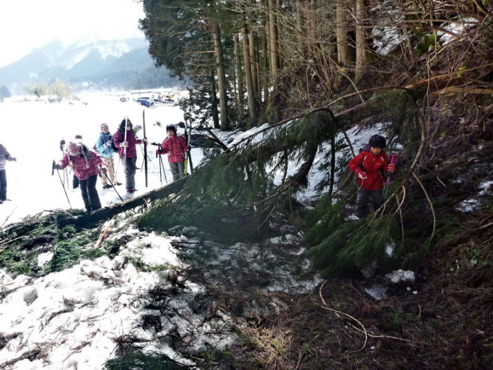能郷谷の入り口に車をとめ、雪の原に上がります。積雪は十分ですが、その一方で雪解けが進み、雪面の下には隠れ岩も出かかっています。平坦な雪原で「歩くスキー」の練習をした後、雪の林道に入っていきます。今シーズンの大雪で倒れた木が道をふさいでいます。ところどころ地面が現われ切通しでは両側の壁から石が落ちかかっています。いきなりの難関を気を付けて突破すると、気持ちのいいスロープが現れます。早速、滑りここみます。今回は初めての参加者が5名。子どもは怖がらずにどんどん突っ込んでいきます(この姿勢が上達につながるのです)。一方お母さん方は、どうしても腰が引けてしまい、うまく板に乗れません(だいたい大人はそういうものです)。それでも、がんばって最後までついてきてくれました。雪の斜面をこわがるかどうか。それが上達の有無を決めます。転んで雪まみれになることを楽しいと感じられるかどうか。それがネイチャースキーが好きになるか否かの分かれ目になります。