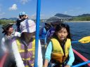 2家族とも去年に引き続いての参加。最初から川下り満喫モード。見た目は良さそうですが例年に比べてアユは少ないようで、釣り人は少なめ。それでも川幅が狭くなっているので、トラブルのないよう、危険そうな場合はみんなで「通りま~す。お願いしま~す。」と声をかけて通過します。瀬を下って流れが緩くなると、ボートから飛び込んでの「川流れタイム」 大人も子どもも喜んで川に入っていました。ただし、今回のEボート(笠松町からお借りしました)はグラブナー製のバケツ型。水の中から大人を引き上げるのみは向いていない(その点ではインセプト製がいい)。それで最後は上陸地点の忠節橋下までは泳いてついてきました。