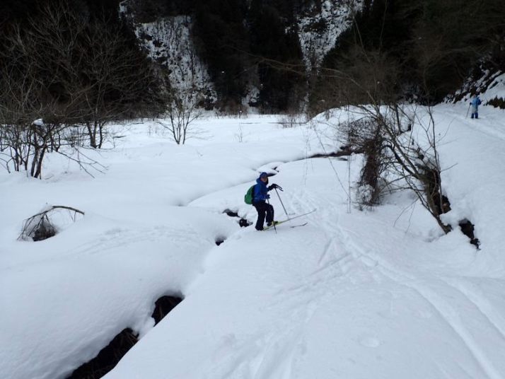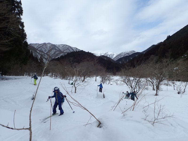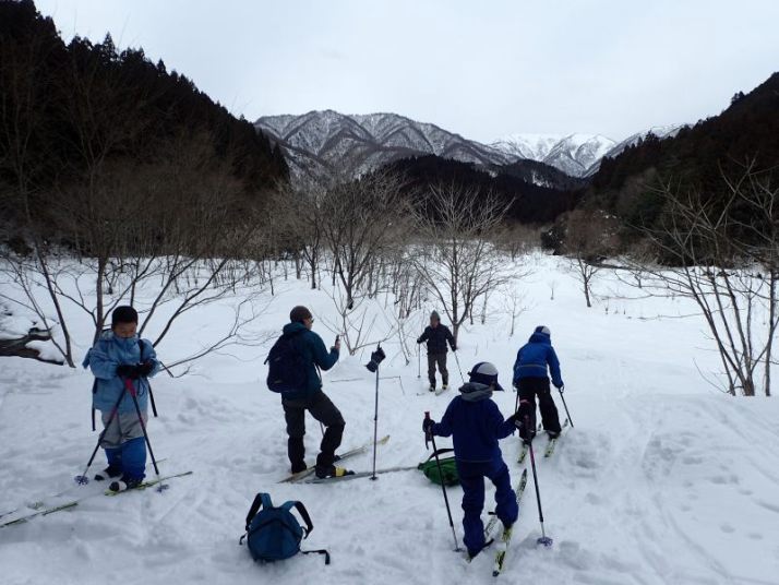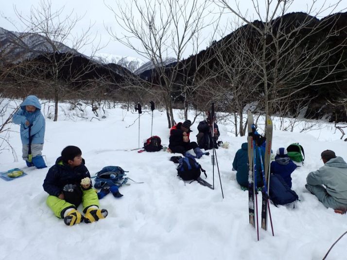 まずは雪の広場で歩くスキーの練習。これが歩いて、登って、滑る、というネイチャスキーの基本になります。今回の雪は重くて初めての人は歩くのにも苦労します。ただし、ネイチャスキー初体験といってもすでに「古墳滑り」を経験している小1のR君は問題なく、歩いて(緩斜面んを)登って滑っています。次に雪の林道を登ります(少し前に犬を連れた猟師さんたちが登っていきました)。切通しをぬけると目の前に雪の能能郷谷が広がります。ここで川に降りていく雪の斜面を滑ります。Kパパ、Yさん親子は楽しんでいますが、初心者のTくん、R君は苦戦(能郷谷は初心者向きではありません)。昼近くになったので、先へ進みます。林道を歩き、谷水が流れている場所はスキーを脱いで渡ります。右手の林に滑り込みます。ここで「雪上ランチ」