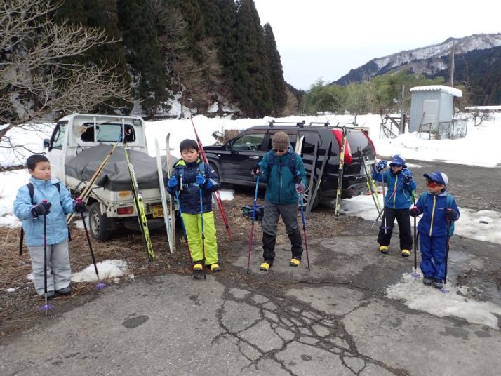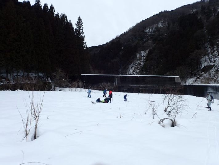 今年の冬は冬らしい冬になりました。ただ、予定していた2週前の根尾東谷は雪が降りすぎて現地に入れず中止になりました。それで今シーズン初めてのネイチャースキーは能郷谷になりました。参加者はネイチャスキー初体験の小学生3名、昨シーズンネイチャスキーを体験して味を覚えた小4男子とお母さん、今回子どもたちは来れなくて一人参加のお父さん(やる気満々)、計6名。スタッフは3名。能郷谷入口までは路面に雪はなくすんなり入れました。