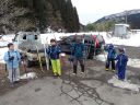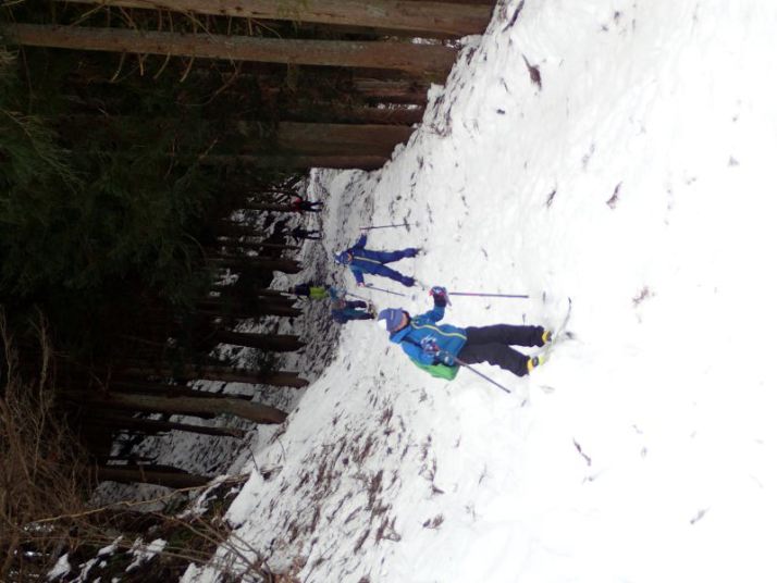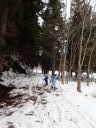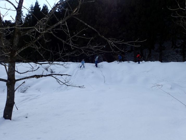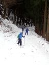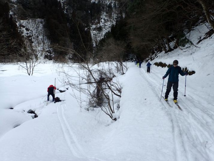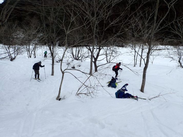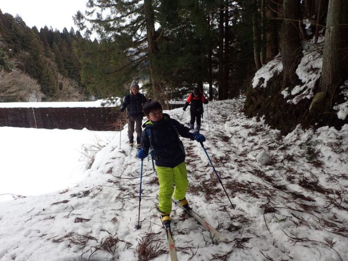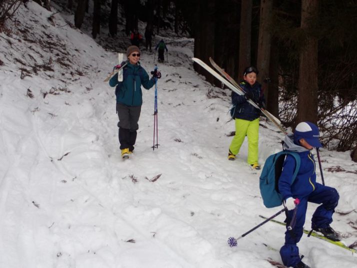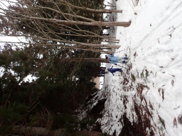 最後は林道入り口への下り。ここはそこそこの斜度があり、人が登った後がでこぼこになっていて滑りにくい。左側は谷に落ちていて危険、右側に逃げるとスギの落ち葉に足をとられる危険があります。ここは各自の選択です。 スキーでトライするか、板を脱いで安全に歩いて下りてくるか。ネイチャスキー初体験のT君は果敢にチャレンジ。途中転びましたがナイストライ。こうして全員無事スタート地点に戻りました。
