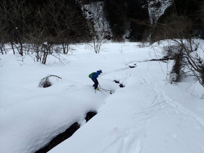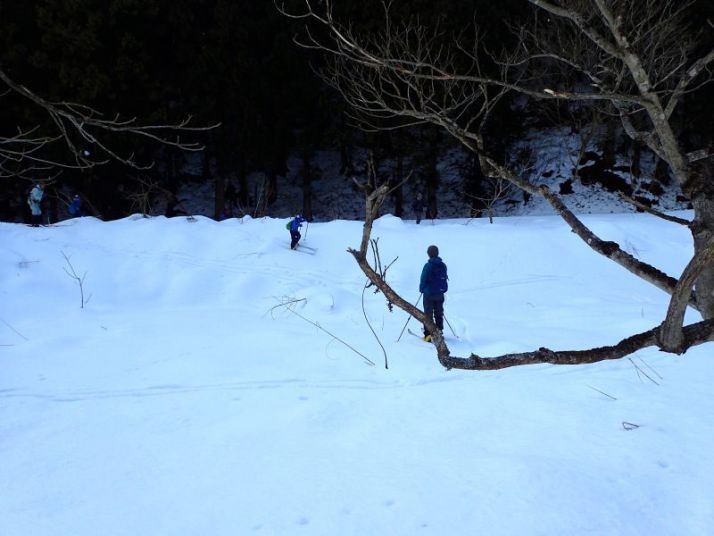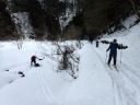 さらに雪のフィールドを目指して奥へ入っていきます。いつものフィールド(河原に段差があって結構な斜面になっている)ここが今回最大遊び場。ちょっとした斜面ですが小さなこぶやうねりがあってなかなか手ごわい。「ライン」を選ばないと足をとられて簡単にこけます。スキー場と違って圧雪されていなくて、雪質も安定していません。もちろん木などの障害物もあります。もちろん思うようには滑れません(だから面白い。何度トライしても飽きない)。ここれは大人も子どもの目いっぱい楽しんでいます。参加者だけでなく、スタッフも楽しんでいます(私良さんも頭から突っ込み雪を食べました)。初心者の参加者はといえば、小3のT君、何度も斜面にトライして、転ばずに降りてくることも出来るようになりました。G君は中なき雪になじむことができず、「中斜面」への トライはできませんでした(ネイチャスキー初体験ではこれが普通です)。