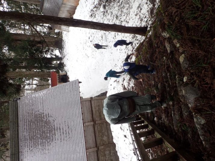 最後に中居神社にお参りして神様にお礼しました。初詣以来ほとんど人が入った形跡がない境内はしっそりとしていました。参拝者のためにビニールシート張られた本殿で最後の「振り返り」をしました。子どもたち「滑るのが楽しかった」。大人たち一様に「子どもたちの雪への適応能力がすごい」(子どもはヒトとしての自然度が高いですね) あらためて、石徹白の自然はすごいですね。