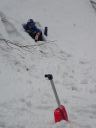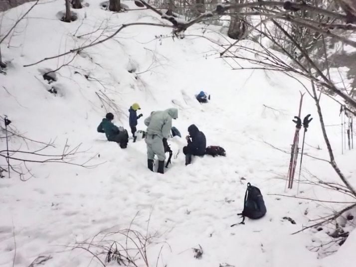 谷が見えるポイントで雪のテーブルを作ります。雪上ランチはネイチャースキーの楽しみです。ただ、この日は細かい雪が降り続いていて、動いていないと寒い。おにぎり3個の私はそうそうにお昼を切り上げ、近くの斜面を登って滑って遊びます。子どもたちもついてきます。(大人はゆっくり食事)