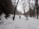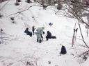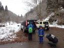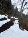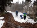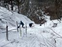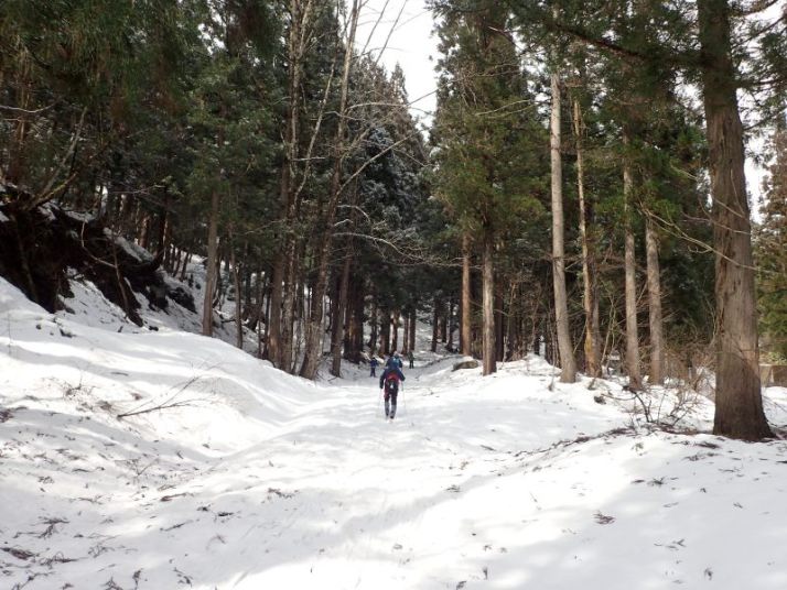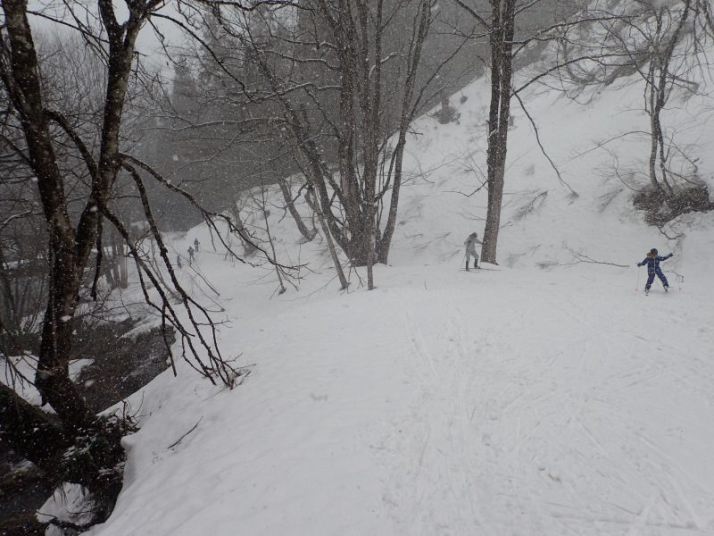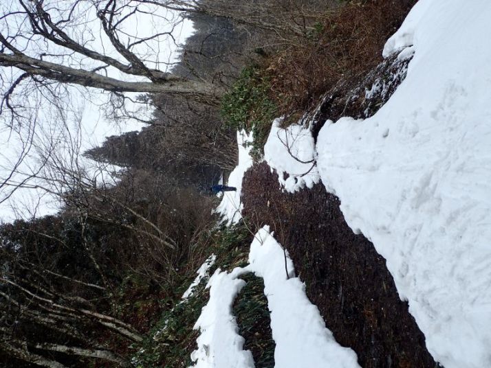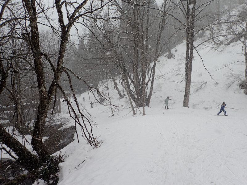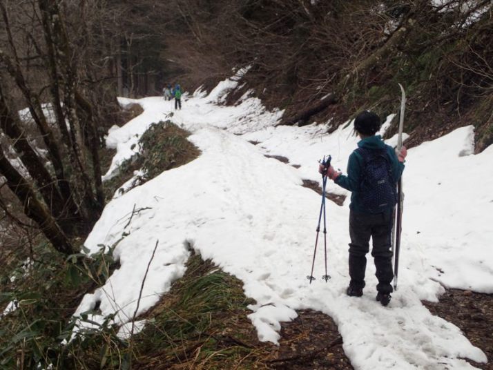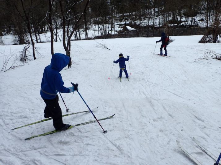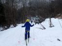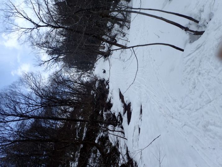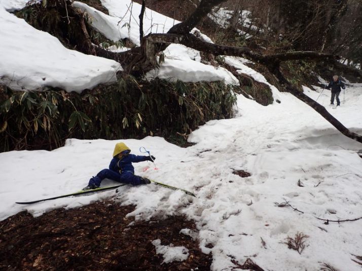 あとは引き返すだけですが、子どもたちは雪の林道で最後も一本。引き返しの林道の下り気持ちよく滑れるところはほとんどありません。逆に滑るところが狭く、谷に落ちそうか危険な個所もあります。それでも子どもたちとKさんは雪がついていれば滑る、という姿勢(いい心がけ)です。苦労しながらも全員無事スタート地点まで戻ることができました。
