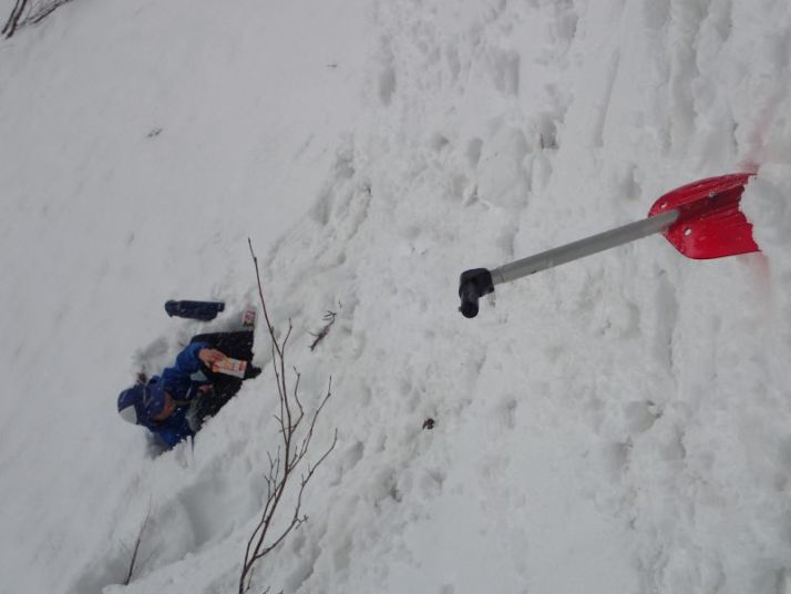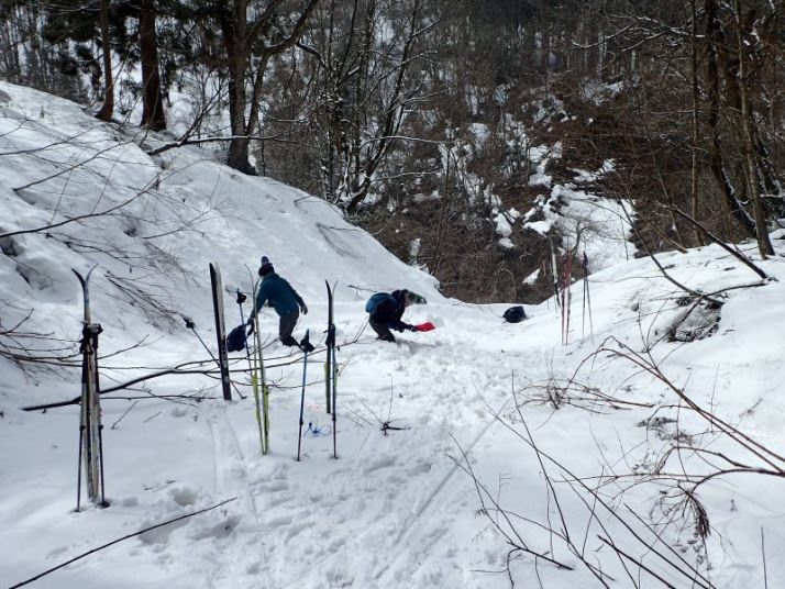 橋を渡り行きの林道に入ります。橋の前まで進み、枝林道で遊びます。皆さん登りはうまいのですが、5cmほど積もった新雪が引っかかるような感じなのか、意外に滑りで苦労していました。小1のR君、スキーへの乗りはいいのですか、曲がれないのでどんどん左端の近づいて行って見ていて谷に落ちないかひやひやしました。スタッフの尚さんはキックワックス(登り用)が効きすぎてつんのめっていました。(私良さんは新雪がちょうどいい具合で、BCクロカンの板で気持ちよく連続ターンができました。)雪の林道を何回も登って滑るのを繰り返した後、先へ進みます。林道は雪解けで何個所も途切れています。そうした場所では板を脱いで担がなくてはなりませんが、Y兄弟とKさんは根性でその都度着脱していました。ヤドリギのある広場までくればその先には進みません。ここで、急な林道斜面の滑降に挑戦です。条件が良ければ気合でトライできるところですが、途中跳ね上がった木の枝が障害になっています。その前でといったん止まればいいのですがそれができない。大人たちはビビって逡巡していますが、ここを滑り降りなければ、ランチポイントにはたどりちきません。まずは兄弟がトライ。転びながら下まで滑り降りてきました。グッドジョブ。大人たちは最初から腰が引けています(それが自然)が、転びながら何とか降りてきました(ここで愚痴を言わないのは皆さん立派)。