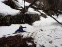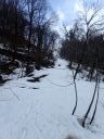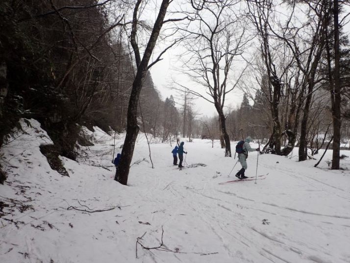 石徹白川の橋のたもとに車を停めて、ここらスタート。今回のメインフィールドは「曲がる」、「止まる」ができないとこなせないので、まずその練習をします。駐車地点からそのまま雪の上に乗りそのまま左岸の河畔林の間を進んでいきます。そのまま進むと岩壁からつららが下がっている場所に出るはずですが、さすがこのところの暖かさでつららはなくなっていました。引き返す途中適当な斜面を見つけて登って滑る練習をします。木の間を塗って滑らないといけないし、前方の木を避けなければなりません(これが本当のネイチャースキー)