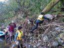 対岸(右岸)に渡り、河畔林が茂る岸に上陸します。川下りをしながらきれいなはずの川岸の林にビニールのゴミなどが引っかかっているのを見るのはとても見苦しく感じられ気になるものです。それで今回もそんなゴミに狙いをつけ回収作戦に乗り出したのですが、これがなかなか難しい。足場が悪く、地の枝にからみついたゴミをはがすのは結構手間がかかります。これも十分にゴミを取り除くと他ができませんでしたが、一応の成果を上げクリーンアップ作戦のゴミの除去は終了。